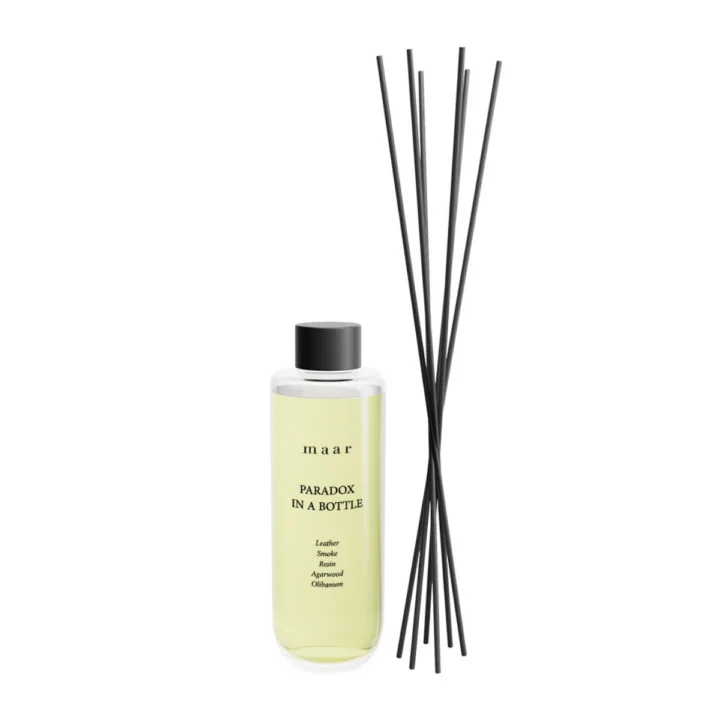 PARADOX IN A BOTTLE – fills spaces with a sophisticated scent that is bursting with character. The notes of leather and smoke, complemented by woody motifs, create an intriguing, speakeasy-like atmosphere. Tips on using maar Home Fragrance: Start by adding a few reed diffusers. When the scent becomes noticeable but you’d like it to be more intense or spread more widely, add more diffusers. If the scent becomes less intense, replace the reed diffusers with new ones. To scent a larger space, fill different rooms with the same fragrance, or acquire several different home fragrances, create a set of 3 home fragrance bottles.